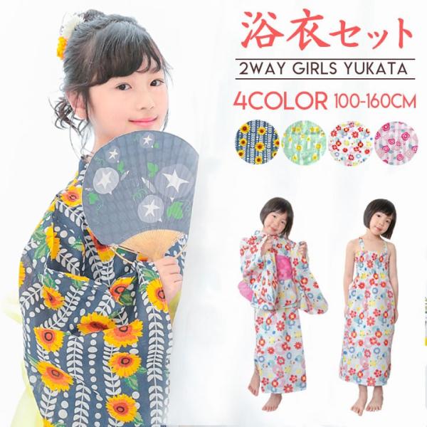 ワンピースになる2way 浴衣 子供 女の子 100cm 110cm 1cm 130cm 140cm 150cm 160cm 浴衣 子供 女の子 セパレート ワンピースになる2way セット 100 110 1 130 140 150 160cm 上衣 兵児帯 浴衣3点セット 子供服 子ども服 キッズ ジュニア 女の子 帯 簡単 花火大会 夏